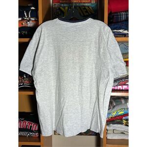 There’s some stains on the front as shown, as well as some tiny pinholes; one on the front, and a tiny one on the back. Single stitch bottom hem, double sleeved.