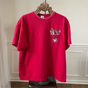 Vintage 1999 Warner Bros. studio store pique cotton pocket T-shirt with Bugs Bunny, Elmer, Fudd, Daffy, duck, Marvin, the Martian embroidered coming out of the pocket, and the Tasmanian devil embroidered on the front of the pocket. 100% cotton. Measures approximately 27 inches shoulder to hem, and 23 inches armpit to armpit
