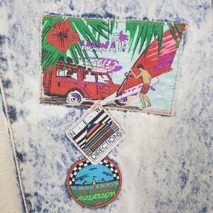 Vintage 90s Zena Acid Washed Bleached Patchwork Hawaii New Directions & 1930 National Aviation Show Checkered Graphic Print Design Denim Blue Jeans