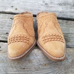 Vintage 90s y2k Camel Tan Suede Boho Western Cowgirl Whipstitch Heeled Mules 6.5