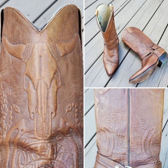 Vintage 90s y2k Handmade Brown Leather Tooled Mexico Western Cowboy Harness Boot