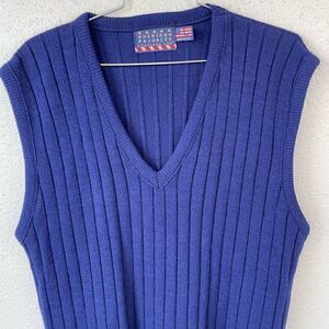 Classic sleeveless v-neck sweater by American Priority measuring 22 inches armpit to armpit laying flat and 28 inches in length from shoulder to hem.