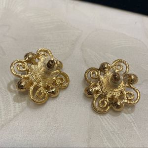 Vintage signed AJC gold tone pierced earrings with faux pearls and rhinestones. New without tags. Earrings measure 1 1/4 inches in diameter.
