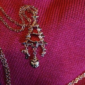 Festive Holidays Pendant. Copyright 1996. Christmas tree with beaded chain swag. One red, two green stones. Dangling charms: Christmas stocking, Jack in the box and candy cane. Long 32 inch chain. Great for you or a collector friend. In the original box.