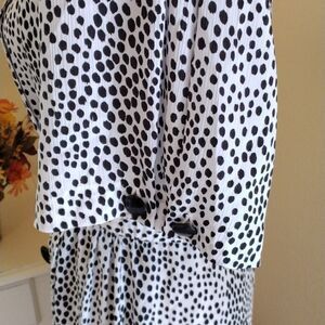 This is a perfect dress, timeless. Designed to be blouson. Snaps and hooks and eyes hold everything together perfectly. Retro buttons trim and go down the left side, floaty sleeves. No size or content tag. This is a lightweight woven poly. Measures 40 at chest, 30 at waist, 42 at hips, 44 long from slightly padded shoulders to hem. Easy breezy and so comfortable.
