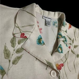 Vintage Alfred Dunner Short Sleeve Cream Floral Jacket. Like a linen meets hessian type fabric but softer. In excellent condition. Colors are Ivory, blue, green, pink and yellow.