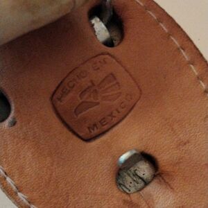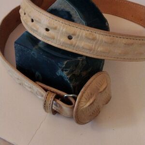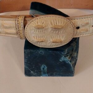 Hornback alligator? Creamy color. Deep texture. Oval in front is balanced and tooled. Closes with a pin. 35 is the longest, 32 is the shortest. 1 3/8 wide. Made in Mexico, excellent condition.