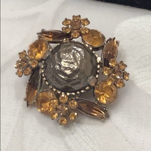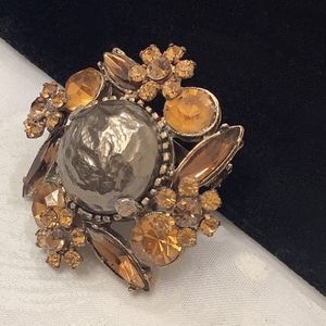 Vintage amber rhinestone flowers surrounding a large faux baroque pearl brooch. In excellent condition.