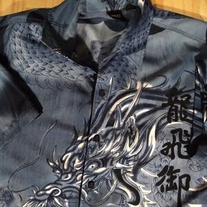 Vintage Amplify Chinese Dragon AOP Polyester Button Down Shirt, Size Large - Measures p2p=25" Length=31" - Excellent Condition, No Flaws