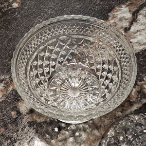 Vintage pressed clear glass lidded candy dish with lid. This is a heavy candy dish weighing about 3 pounds and will make a beautiful addition to your decor or glass collection. Condition is used. In excellent condition. No chips or cracks.