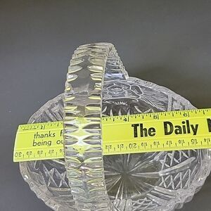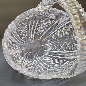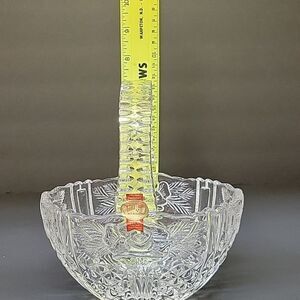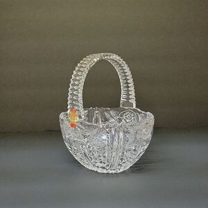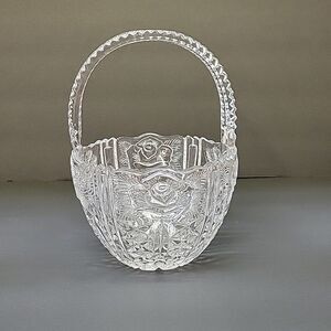 The basket features a lovely rose motif, possibly in the Dorsette pattern, with roses and leaves. Made In Germany 24% Lead Crystal Clear Basket With Roses It measures-7” H x 6 1/2” L x 5” W. It is a heavy, cut glass crystal piece that could be used for various purposes, such as holding candy, flowers, or as a decorative item.