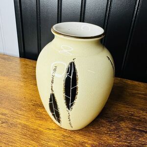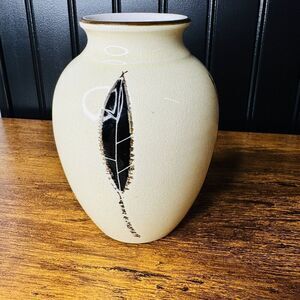 This vintage Italian vase is a beautiful addition to any decor. Its textured ceramic material and black leaf pattern give it a unique and timeless style. Handmade in Italy, this antique vase features a off white and black finish that adds a touch of elegance to any room.