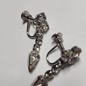 Vintage Art Deco 1950s Silver Crystal Drop Earrings Screw Back