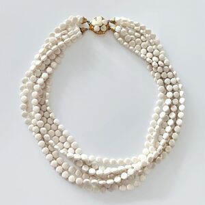 Old plastic celluloid circular white beads seven strand necklace with gold decorative clasp. Clasp is still bright and shiny and works properly. One of the beads on clasp has a chip. Overall excellent condition for its age. Measures 23” in length.