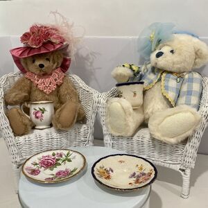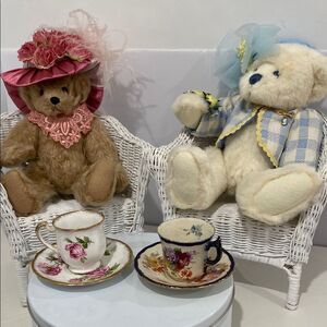 Adorable teddy bears dressed in elegant outfits. Includes a set of floral teacups and saucers. Perfect for collectors.