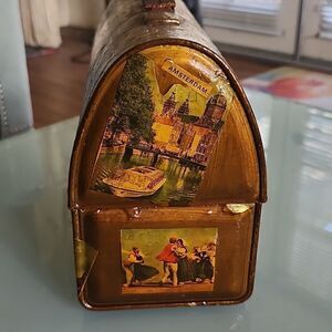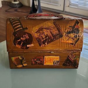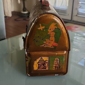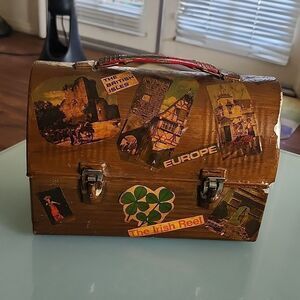 Very cool, and one of a kind, repurposed decoupage finish Thermos lunch pail, handbag. The decoupage is of various images of Europe. This could be used for storage, or for pretty shelf art, but what a cute idea for a repurposed purse! So very steampunk, or boho!! Some slight damage on the right side,(see 2nd photo), but I think it adds to its antiquity vibe. C1.7221