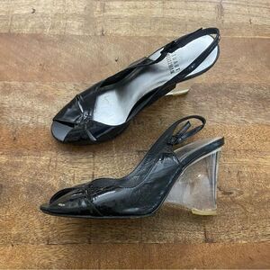 One of a kind pair of vintage Stuart Weitzman Lucifer wedge Peep Toe slingbacks Pumps in excellent condition. Patent leather uppers with leather soles and FABULOUS thick lucite wedge heels. Size 6 1/2 m with 3.5 inch heels.