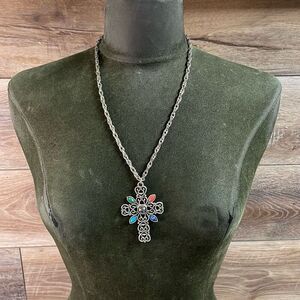1970’s Filigree Cross Pendant Silvertone with Colorful Stones and marked AVON