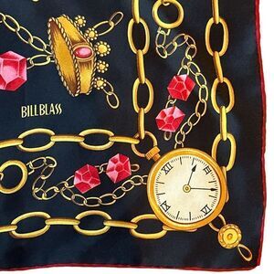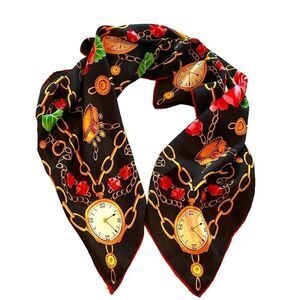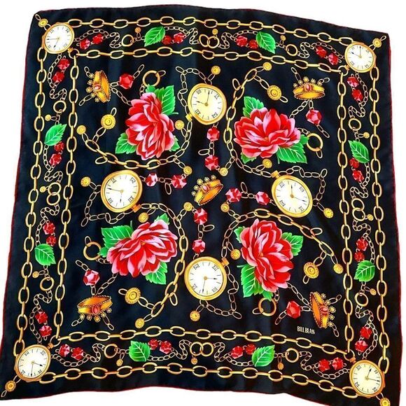 Vintage BILL BLASS SILK roses, pocket watches, chain scarf-black red gold