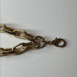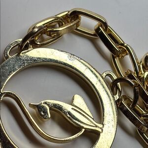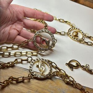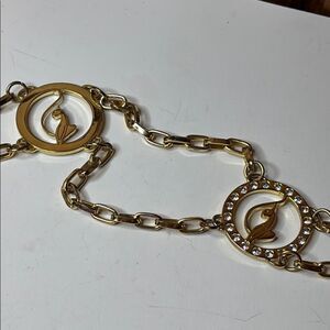 Elegant gold tone chain link belt featuring crystal accents. Perfect for adding a touch of sophistication to any outfit.