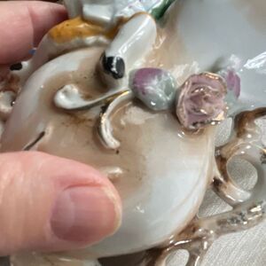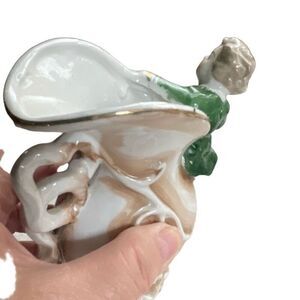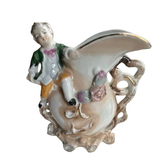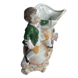 Vintage Bachelor Boy ornate flower vase. Young lad hanging on pitcher stored with flowers and vines. No cracks chips or repairs.