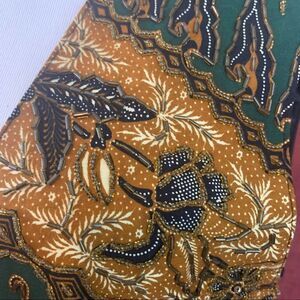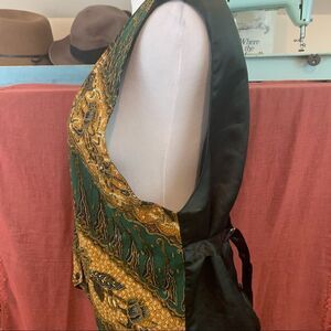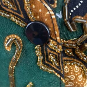 Funky vintage mixed pattern beaded vest in dark green and golden rod colors. Whimsical floral pattern embellished with gorgeous hand beading. Adjustable tab in back, to accommodate a range of sizes. Tagged all sizes, but would fit best between 8 and 12, I believe. Mannequin is size 4 for reference