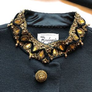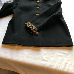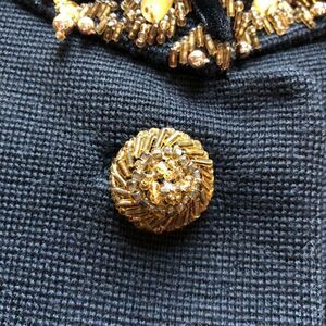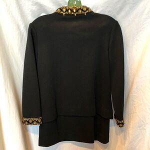 Excellent condition! Beaded collar, cuffs and buttons. Clasp at neck. Pencil skirt with side zip and clasp.