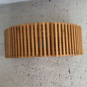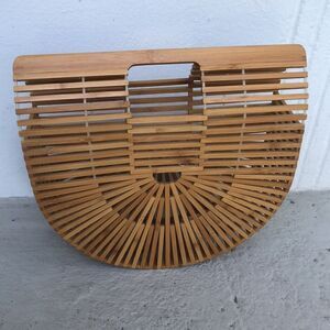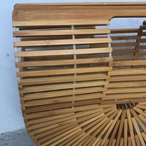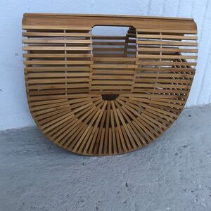 This bamboo bag is in great condition check out the pictures. Measuring across the top is 12.5 to the top of the handles is 12.5 and the width is 4.25