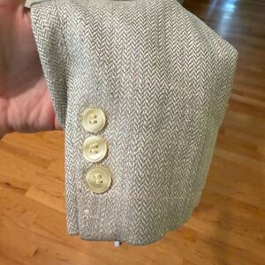 Gorgeous vintage Baskin size 6 blazer. This blazer is gray with hints of green and pink within the herringbone detail. The blazer is in fantastic condition and is fully lined - fabric is a silk blend.