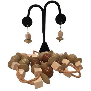 Vintage faux wood bead necklace in neutral colors with matching pierced earrings. New without tags. Necklace measures 36 inches around without a closure. (I tried to double the necklace on myself, but could not.) Beads are various colors and sizes with the largest ones measuring 3/4 in diameter. Earrings measure 1 3/4 inches long by 3/4 inch.