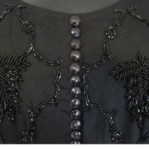Vintage Kathie Lee beautiful rayon dress. Beaded bodice with button detail front, puff shoulder made strong with shoulder pads, back zip closure with hook and eye clasp, snap in back skirt to close under the shirt part, long tapered sleeves with button detail.