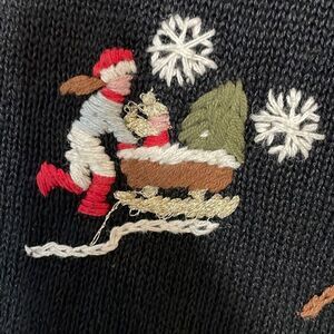 This is vintage and so unique! It’s a size small (21” pit to pit) and mostly ramie material. All those little designs appear to be hand stitched on the front. Pullover Crewneck. Black skiers poinsettia log cabin deer and trees. It might be too pretty to win the ugly sweater competition?!?!
