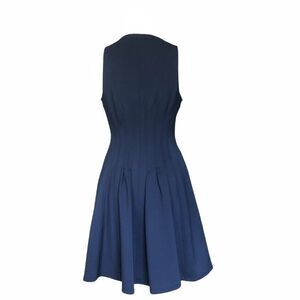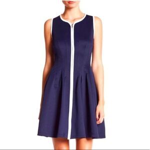 Betsey Johnson Sleeveless Navy Zipper-Front Vintage/Retro Fit and Flare Dress with white piping along jewel neckline, around arm holes, and down center front.