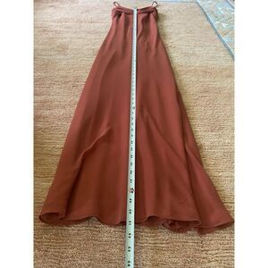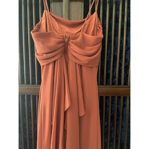 Elegant full-length formal gown in a rich terracotta shade with a draped cowl neckline, adjustable spaghetti straps, and dramatic gathered detailing with cascading fabric in the back. Made in the USA from imported fabric, featuring 100% polyester shell with 100% acetate lining. Built-in bust padding, back zip closure, and fully lined. Approximate measurements: pit to pit 14.5”, length 53”. Excellent vintage condition with no visible flaws.