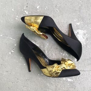 Black satin with gold bows, super cute, vintage, disco heels. Please look at the pictures need a drop of gold on a spot that I show in pictures. Heel height is 3.25.