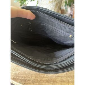 Vintage black genuine leather clutch made in China with chevron panel detail on the front and dual zippered compartments inside. Approx. 13.5” wide x 9” tall. Features black fabric lining, interior zip pocket, and soft structure with light wrinkling throughout from storage. No brand tag visible. Clean and functional, perfect for evening or minimalist everyday use.
