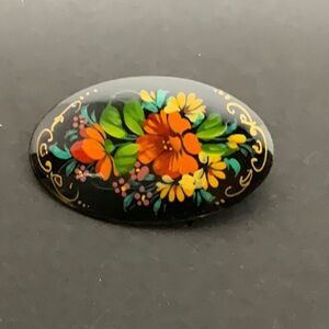 Vintage Black Lacquered Brooch with Handpainted Flowers. WA250