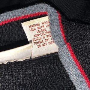 made in the USA100% acrylic, black red light, gray and dark gray striped pullover sweater. Textured stripes. Stretchy ribbed striped mock neck. Excellent vintage condition. Women’s size medium.