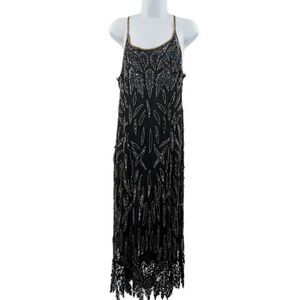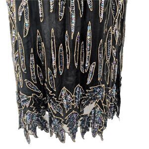 This stunning vintage dress by Kavhl captures the essence of Art Deco glamour, featuring intricate beadwork in black, silver, and iridescent tones that contrast beautifully against a black silk base. The dress’s design consists of elongated leaf or feather shapes cascading down its length, creating an elegant, fluid look. Additional beadwork adorns the neckline, enhancing its vintage charm, while thin straps lend a delicate, flapper-style silhouette. The hemline is finished with beaded fringe, adding playful movement and an eye-catching touch, ideal for evening wear or formal occasions.