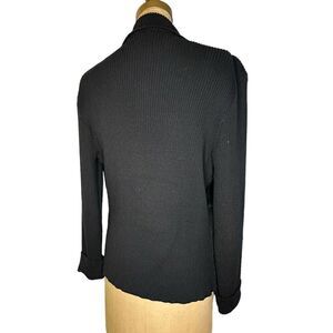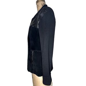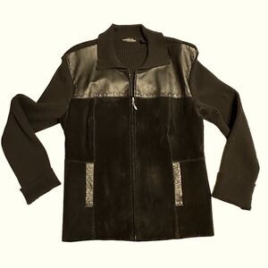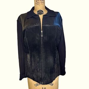 Vintage Essentials by Milano Black Suede, leather and ribbed Jersey knit Collared Full Zip short Jacket.. Jersey has some good stretch to it, cuffs turn back.