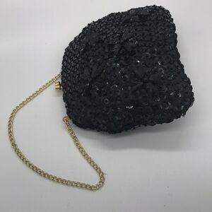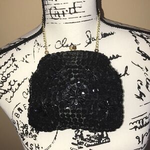 Beautiful black evening bag 5” gold tone chain 5 1/2” bag no flaws