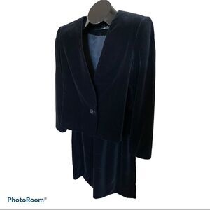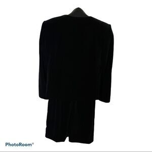 Excellent condition, black crushed velvet skirt suit. The jacket has one button closure and shoulder pads, size 10 Petite. 40” bust, 23” length. The skirt features an elastic waistband and is size small. 24” waist, 24” length.