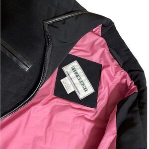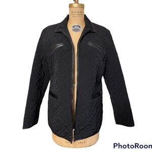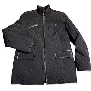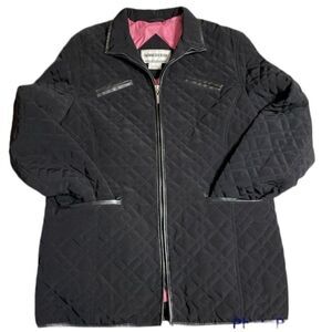 black quilted zip up jacket has faux leather trim around pockets, cuffs, collar etc. Medium weight.