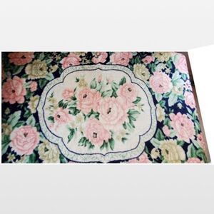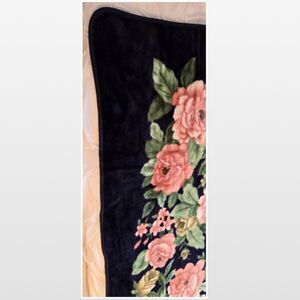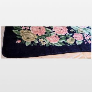 Vintage queen size fleece dark blue bedspread with pink rose flowers. Solaron Mink like thick faux mink!