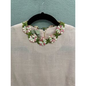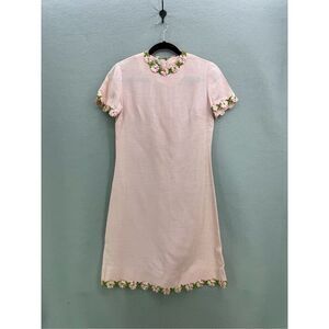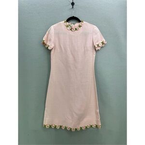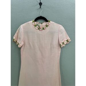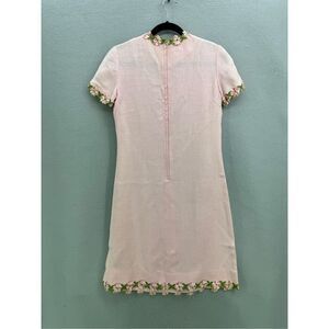 This is an amazing vintage dress! A classic pink sheets dress with floral appliqué around the cuffs and collar. From the 60s or 70s!