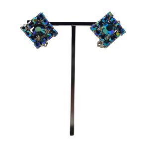 Vintage Blue Aurora Borealis Rhinestone Earrings | Square Diamond Design