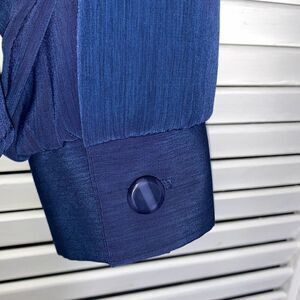 S. G. Sport collection, silky dark blue button-down blouse with neck bowtie lovely blue striped buttons. Bold shoulder. Shoulder pads easily removed. Puckered cuff button sleeves. Excellent vintage condition. Women’s size large.