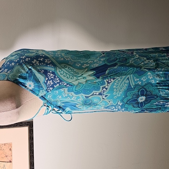 Embrace elegance with this stunning blue floral dress. Perfect for any occasion, its spaghetti straps add a touch of sophistication. Y2K fairy core. Hankerchief hem. % rayon. size large. pit to pit flat measurement is 17". The waist flat measurement is 19". very good used condition. 0