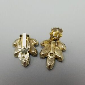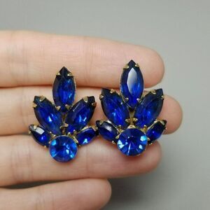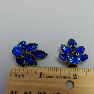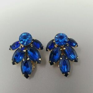Vintage Blue Marquise Shape Rhinestone Clip On Earrings, Prong Set Gold Tone