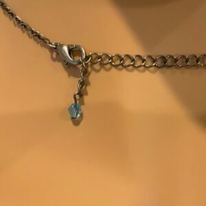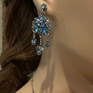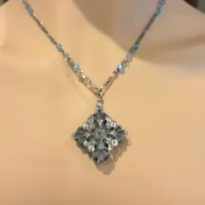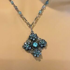 Vintage baby blue rhinestone pendant with beaded silver tone costume necklace with baby blue chandelier earrings to match. I can’t see a marking but my eyes are not great. I have had this in my jewelry box for over 20 years. Great used condition. Gorgeous vintage Victorian style set that would accent any outfit.